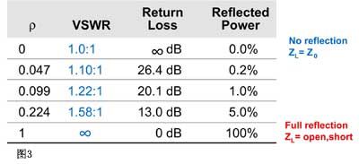 如果某個信號波從一種特征阻抗傳輸?shù)搅硪环N不同的特征阻抗,那么就會引起信號反射和反向傳輸。如果阻抗相同,就不會發(fā)生反射。當(dāng)由于阻抗不連續(xù)而發(fā)生信號發(fā)射時,就會在傳輸線的兩個方向上出現(xiàn)信號波的傳輸。在這兩個波相位相同的點(diǎn)上,將出現(xiàn)最大的電壓幅值Vmax;在它們相位相差180度的點(diǎn)上,將出現(xiàn) Vmin。Vmax和Vmin的比值稱為電壓駐波比,即VSWR。VSWR是衡量某個連接器或某條線纜的阻抗是否接近50歐姆的一個指標(biāo)。圖3給出了理想情況下全匹配(沒有反射)、理想開路(100%反射),以及極端情況下這三個值之間的關(guān)系。