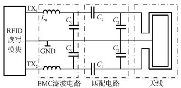 EMC濾波電路濾去了載波頻率為13. 56 MHz阻抗變換時的諧波干擾。它有一個固定的諧振頻率,這個頻率是實際數(shù)據(jù)傳輸率和最高副載波頻率的結合。如用曼切斯特編碼時,傳輸?shù)淖罡邤?shù)據(jù)率為424 kbit/ s,頻率為848 kHz,則諧振頻率為14. 408MHz。