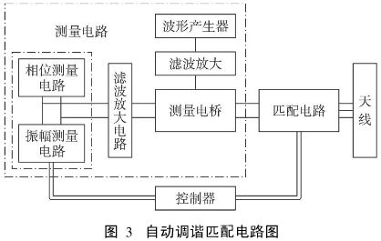 本文提出了一種自動匹配技術,其電路如圖3所示,主要包含測量電路,匹配電路和控制電路。因為手工匹配方法耗時長,且需要良好的意識和豐富的經(jīng)驗來選擇合適的電容,另外必須配備一些昂貴的設備,如網(wǎng)絡分析儀或阻抗分析儀等。對于一些小公司來說,是不現(xiàn)實的。同時,一些手持式RF設備的發(fā)展使得手動匹配越來越不適應。對于這些移動設備,最理想的天線電路應該僅僅包含集成模塊,且隨著阻抗變化可以自動匹配。