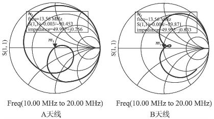 設計完成后,用A,B兩種阻抗不同的天線測試了完整的調(diào)諧系統(tǒng),每種天線測試2 到3 輪不等。結果如圖7所示,對于A, B兩種天線的任何一種,都找到了最優(yōu)C1 和C2 的組合。當頻率為13. 56MHz時,兩類天線的反射系數(shù)雖然與0點都有一定的偏差,但其偏差都在可接受范圍之內(nèi)。