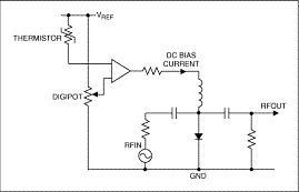 有些系統(tǒng)可能需要進(jìn)行溫度補(bǔ)償(圖3),簡化電路中,數(shù)字電位器IC建立固定或可調(diào)偏置電平,熱敏電阻提供溫度輸入。這兩個輸入連接到運(yùn)算放大器,產(chǎn)生的輸出通過一個電阻驅(qū)動PIN二極管。