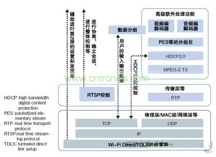 Wi-Fi Display是以無需經由WLAN接入點即可在終端間直接通信的標準“Wi-Fi Direct”為基礎,由上層的協(xié)議棧軟件構成的安裝指南。鎖定終端服務的“服務發(fā)現(xiàn)(Service Discovery)”等的處理利用Wi-Fi Direct進行,影像的壓縮/解壓處理及管理數(shù)據(jù)流的傳輸層等利用Wi-Fi Display處理(圖2)。壓縮/解壓采用H.264格式。由于最近的智能手機不但標配WLAN功能,采用內置H.264編解碼器電路GPU的終端也很多,因此Wi-Fi Display還具有易于配備到終端中的特點。“在受限于安裝面積和耗電量的智能手機中,無需追加硬件即可配備的優(yōu)勢非常大”(Cavium公司的柴田)。