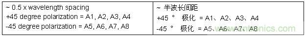 此例為一個 8 陣元物理天線,采用兩組天線單元配置。兩組天線單元彼此以 90? 正交交叉極化。天線組 0 包括天線單元 1 至 4,以 +45? 進(jìn)行極化。天線組 1 包括天線單元 5 至 8,以 -45進(jìn)行極化。