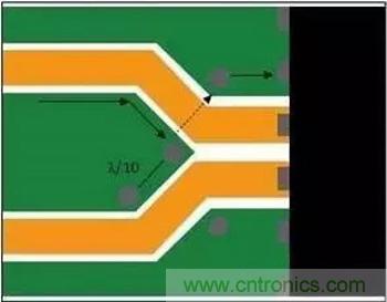 時(shí)鐘分布或合成器設(shè)備路由出來、用于承載相同頻率的跡線集群可能相鄰而行,因?yàn)楦蓴_源音調(diào)已經(jīng)存在于接收器線路上。不過,分組的線路最終會(huì)分散。分散時(shí),應(yīng)在分散線路之間提供接地灌流,并在其開始分散的地方灌入通孔,以便感應(yīng)回流沿著額定回流路徑流回。在圖3中,接地島末端的通孔可使感應(yīng)電流流到參考層上。接地灌流上其它通孔之間的間隔不要超過一個(gè)波長(zhǎng)的十分之一,以確保接地不會(huì)成為共振結(jié)構(gòu)。