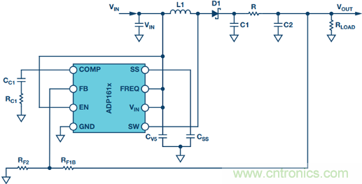 圖3. 在輸出端添加RC濾波器的ADP161x低輸出電流升壓轉(zhuǎn)換器設(shè)計(jì)