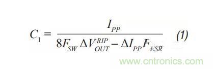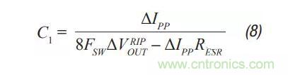 第1步:正如之前的拓?fù)?,選擇C1,使其等于沒(méi)有輸出濾波器時(shí)的情況。10 mV p-p至100 mV p-p是個(gè)不錯(cuò)的開(kāi)始,具體取決于最終目標(biāo)輸出紋波。C1隨后可通過(guò)公式8計(jì)算得出。C1在這個(gè)拓?fù)渲锌梢圆捎帽戎巴負(fù)涓〉臄?shù)值,因?yàn)闉V波器效率更高。