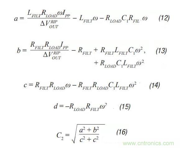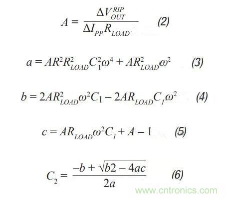 第3步:C2隨后可通過(guò)公式2至公式6計(jì)算得出。A、a、b和c是簡(jiǎn)化計(jì)算的中間值,沒(méi)有實(shí)際意義。這些公式假定R < />LOAD,且每個(gè)電容的ESR較小。這些都是很好的假設(shè),引入的誤差很小。C2應(yīng)等于或大于C1。可調(diào)節(jié)第1步中的紋波,使其成為可能。