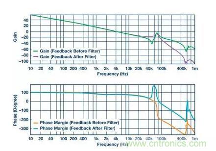 反饋在濾波器電感之前或之后獲取。人們沒(méi)有想到的是,哪怕濾波器不在反饋環(huán)路內(nèi)部,開(kāi)環(huán)波特圖依然存在非常大的變化。由于控制環(huán)路無(wú)論濾波器是否在反饋環(huán)路中都會(huì)受影響,因此也應(yīng)對(duì)其進(jìn)行適當(dāng)補(bǔ)償。一般而言,這意味著將目標(biāo)交越頻率向下調(diào)整至不超過(guò)濾波器諧振頻率(FRES)的五分之一到十分之一。