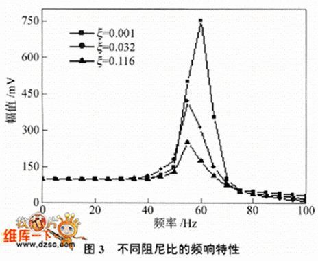 根據(jù)式(15)的光纖光柵加速度傳感器的數(shù)學模型,設計了固定頻率fn=67Hz的低頻光纖光柵加速度傳感器.彈性梁尺寸為L=80mm,h=1mm,b=5mm,材料選用碳纖維,彈性模量E=128GPa,質量塊m=8.8 g,布拉格光纖光柵在靜止狀態(tài)下的波長λB=1551.75nm,波長變化靈敏度80 pm•g-1,經過光電探測器轉化為電信號后的靈敏度為s=200mV.g-1.對傳感器的動態(tài)特性在ES-015振動臺上進行了實驗研究,圖3是在三種不同阻尼比ε時的幅頻特性實驗中給激振器旋加的加速度值為0.5g(g為重力加速度),整個測量頻帶是0~100Hz.從圖中可以看出:在l~45 Hz以下是加速度計的幅值平坦區(qū),在45~65Hz是共振區(qū),在65Hz以上是衰減區(qū),所以選用1~45Hz作為其工作區(qū);在共振區(qū)內加速度計的特性也與阻尼有關,隨著阻尼比的增加振動幅值呈下降趨勢,同時共振頻率也向低頻偏移,但阻尼比對幅值的影響比較顯著一些,所以通過選用適當?shù)淖枘峥梢愿淖兗铀俣扔嫷墓舱駞^(qū)特性,防止其工作在共振區(qū)時由于幅值過大引起傳感器損壞.通常阻尼選在O.707附近,這與其他振動傳感器是相同的.
