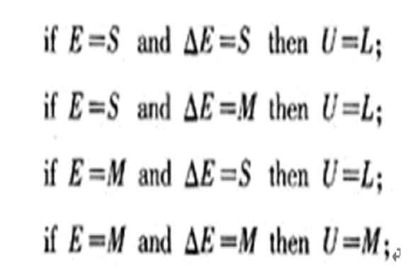 基于神經(jīng)網(wǎng)絡(luò)在推理方面不足,故借助于模糊控制強大的推理功能,提取有效的條件語句,進而加快網(wǎng)絡(luò)的訓(xùn)練速度。選取偏差E和偏差變化率△E作為輸入和控制量U作為輸出。偏差E和偏差變化率△E的模糊量分別為大(L),中(M),小(S),創(chuàng)立描述條件推理表格如表1。