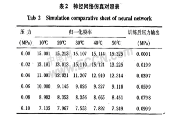 境下進行神經(jīng)網(wǎng)絡(luò)的訓(xùn)練和仿真,通過神經(jīng)網(wǎng)絡(luò)工具箱,編制相應(yīng)的仿真訓(xùn)練程序,實現(xiàn)仿真過程。在仿真時,隨機選取幾組頻率-溫度作為輸入,最后,進行標定壓力值和仿真結(jié)果的比較。仿真數(shù)據(jù)結(jié)果如表2。