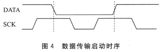 微處理器和溫濕度傳感器通信采用串行二線接口SCK和DATA,其中SCK為時(shí)鐘線,DATA為數(shù)據(jù)線。該二線串行通信協(xié)議和I2C協(xié)議是不兼容的。在程序開始,微處理器需要用一組“啟動(dòng)傳輸”時(shí)序表示數(shù)據(jù)傳輸?shù)膯?dòng),如圖4所示。當(dāng)SCK時(shí)鐘為高電平時(shí),DATA翻轉(zhuǎn)為低電平;緊接著SCK變?yōu)榈碗娖?,隨后又變?yōu)楦唠娖?在SCK時(shí)鐘為高電平時(shí),DATA再次翻轉(zhuǎn)為高電平。