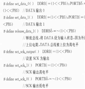 通過以上宏定義,可以實(shí)現(xiàn)SCK和DATA總線的各種輸入和輸出狀態(tài)。為了模擬該二線串行數(shù)字協(xié)議,還需要一個(gè)延時(shí)函數(shù)。WINAVR庫函數(shù)提供了一個(gè)延時(shí)函數(shù)_delay_loop_2(unslgned char s),該延時(shí)函數(shù)運(yùn)行用4個(gè)時(shí)鐘周期,所以白定義延時(shí)1μs函數(shù)可以定義如下:#deftne CPU_CRYSTAL 7.3728