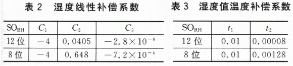 式中:RHincar為經(jīng)過線性補(bǔ)償后的濕度值,SORH為相對(duì)濕度測(cè)量值,C1、C2、C3為線性補(bǔ)償系數(shù),取值如表2所列。