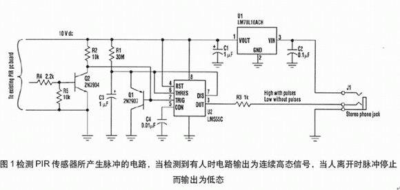 通常,當所檢測區(qū)域無人時,無脈沖被檢測,而輸出為低態(tài)。當檢測到脈沖時,輸出變高態(tài)。電源(12~14Vdc)通過立體聲電話插口(與輸出信號一道)供電,然后穩(wěn)壓到+10V。此電路放置在PIR傳感器內,電話插口放在機盒的下部。電阻器R4連接PIR LED驅動器。地和+10V連接到PIR中的適當位置。