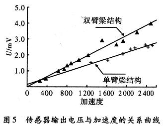 對制作的加速度傳感器樣品,在馬希特擊錘上進行了大量地沖擊標定測試,測試結(jié)果表明:設(shè)計和加工制作的加速度計樣品在進行加速度的沖擊時,有較好的信號輸出,單臂梁結(jié)構(gòu)的加速度計的靈敏度為1 μV/gn;雙臂梁結(jié)構(gòu)的加速度計的靈敏度為1.6μV/gn,與理論設(shè)計值基本吻合。