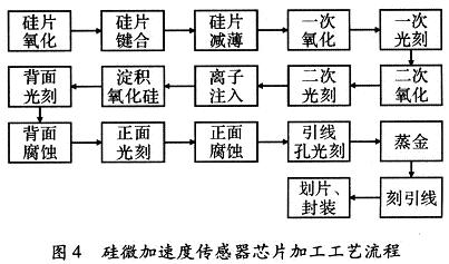 壓阻式傳感器的懸臂梁常采用CVD工藝在硅片上外延生長一層外延層刻蝕而成,文中試用鍵合工藝制造壓阻式加速度傳感器。采用鍵合工藝優(yōu)點是能得到高質(zhì)量的外延層,且懸臂梁的厚度通過硅片減薄工藝易于得到保證,精細的硅片單面研磨,厚度誤差可以控制在0.5 μm以內(nèi);且不需要電化學(xué)自停止腐蝕,依靠EPW腐蝕液對SiO2的腐蝕速度極慢,使得腐蝕過程停止在SiO2層上,從而保證了硅片減薄后的厚度即為彈性梁的厚度。制作的傳感器芯片尺寸3 mm×5 mm,封裝在陶瓷管殼中。選n型硅片,晶向(100),直徑為50mm,厚度為300μm,電阻率為5~12 Ω·cm。傳感器芯片加工工藝流程,如圖4所示。