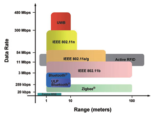 根據(jù)不同的頻率、目標(biāo)數(shù)據(jù)速率、距離,以及互操作性的理想水平,新出現(xiàn)了幾種工作在ISM頻率空間中的標(biāo)準(zhǔn)。圖1顯示了無線工程師進(jìn)行產(chǎn)品開發(fā)時最常使用的一些標(biāo)準(zhǔn)。