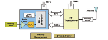 每個無線傳感器都被看作一個節(jié)點(diǎn),擁有無線通信能力,同時還具有一定的信號處理與網(wǎng)絡(luò)數(shù)據(jù)的智能。根據(jù)應(yīng)用的類型,每個節(jié)點(diǎn)都可以有一個指定的地址。圖2顯示了某個節(jié)點(diǎn)的通用結(jié)構(gòu)圖。它一般會包括一個傳感裝置、一個數(shù)據(jù)處理微控制器,以及一個無線連接RF模塊。根據(jù)不同的網(wǎng)絡(luò)定義,RF模塊可以起到一個簡單發(fā)射器或者收發(fā)器 (TX/RX)的作用。進(jìn)行節(jié)點(diǎn)設(shè)計(jì)時,注意電流消耗和處理能力非常的重要。微控制器的內(nèi)存非常依賴于所使用的軟件棧。