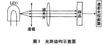 系統(tǒng)要求光電傳感探測部分具有較高的檢測精度和穩(wěn)定性,且實時性高,即需要對待測海水進行連續(xù)不間斷的在線測量,因此采用近紅外LED作為光源。光源發(fā)出的近紅外光經過光學鏡組選擇得到對溢油具有特征吸收的分析光,經透射與樣品室的樣品發(fā)生相互作用,然后進入光電探測器,將光信號轉換為電信號,從而實現(xiàn)對樣品成分的檢測見圖1所示。