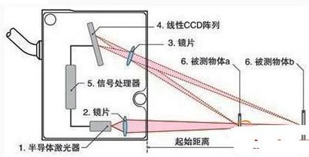 激光發(fā)射器通過(guò)鏡頭將可見(jiàn)紅色激光射向物體表面,經(jīng)物體反射的激光通過(guò)接受器鏡頭,被內(nèi)部的CCD線性相機(jī)接受,根據(jù)不同的距離,CCD線性相機(jī)可以在不同的角度下“看見(jiàn)”這個(gè)光點(diǎn)。根據(jù)這個(gè)角度即知的激光和相機(jī)之間的距離,數(shù)字信號(hào)處理器就能計(jì)算出傳感器和被測(cè)物之間的距離。