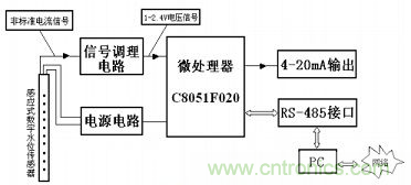 信號(hào)調(diào)理電路是將傳感器輸出的非標(biāo)準(zhǔn)電流信號(hào)轉(zhuǎn)化為電壓信號(hào),為C8051F020模數(shù)轉(zhuǎn)換做準(zhǔn)備。經(jīng)過(guò)單片機(jī)模數(shù)轉(zhuǎn)換后,可以將傳感器信號(hào)轉(zhuǎn)化為數(shù)字信號(hào),然后就可以很方便地進(jìn)行下面的操作:存儲(chǔ)水文數(shù)據(jù)、通過(guò)AD421輸出4~20 mA的標(biāo)準(zhǔn)電流信號(hào)、RS-485接口輸出等。