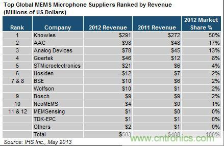 隨著市場的發(fā)展,MEMS麥克風(fēng)市場的格局也在不斷的變化中。在HIS最新的分析報告顯示,樓氏電子繼續(xù)主宰MEMS麥克風(fēng)市場,2012年以2.9億美元營收傲視所有其它供應(yīng)商,樓氏一家營收已實際占到整個MEMS麥克風(fēng)市場的一半。中國AAC和歌爾聲學(xué)排名第二和第四,ST異軍突起,擠進(jìn)前五。