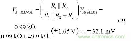 由于DAC可以擺動(dòng)±1.65 V,因此,總失調(diào)調(diào)整范圍可通過(guò)由RA 以及R1和R2的并聯(lián)組合形成的分壓器給定,其計(jì)算方法如下: