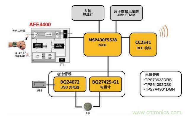 圖4中就是這樣一個TIDesign (TIDA-00011),其中展示了一個典型的光學(xué)、佩帶在手腕上的心率系統(tǒng)應(yīng)用。這個手腕佩帶式心率監(jiān)視器參考設(shè)計說明了TI技術(shù)是如何組合在一起來提供完整解決方案的。使用一個LED到光電二極管光信號的轉(zhuǎn)換,TI的AFE4400($3.3188)感測由佩帶者脈搏跳動所引起的皮膚表面變化,然后將模擬信號放大并轉(zhuǎn)換為數(shù)字信號,然后再將此數(shù)字信號傳遞給MSP430($2.0250) MCU。基于TI SimpleLinkTM Bluetooth低能耗CC2541($2.3625)無線MCU的模塊提供到智能手機(jī)或其他本地系統(tǒng)的無線連接。非易失性鐵電隨機(jī)存儲器提供數(shù)據(jù)記錄功能,而加速計感測身體運動。此參考設(shè)計還包括管理電池電量和不同系統(tǒng)功能的器件。希望設(shè)計此類終端設(shè)備的開發(fā)人員可以從TI直接訪問所有內(nèi)容,原樣搭建這一系統(tǒng),并且立即運行。在這里,要定制解決方案,開發(fā)人員只需添加其自己的知識產(chǎn)權(quán)即可。