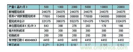 4”圓晶片生產(chǎn)線生產(chǎn)MEMS壓力傳感器Die成本估計如表所示,新增固定成本是指為該項目投入的人員成本和新設備的折舊(人員:專家1名+MEMS設計師2名+工程師4名+工藝師5名+技工12名,年成本147萬元,新增設備投入650萬元,按90%四年折舊計算);現(xiàn)有4”線成本是指在5次光刻條件下使用4”線的成本(包括人工、化劑、水電、備件等的均攤成本);硅片材料成本是指雙拋4寸硅片的價格。