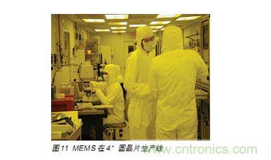 與傳統(tǒng)IC行業(yè)注重二維靜止的電路設計不同,MEMS以理論力學為基礎,結合電路知識設計三維動態(tài)產(chǎn)品。對于在微米尺度進行機械設計會更多地依靠經(jīng)驗,設計開發(fā)工具(Ansys)也與傳統(tǒng)IC(如EDA)不同。MEMS加工除了使用大量傳統(tǒng)的IC工藝,還需要一些特殊工藝,如雙面刻蝕,雙面光刻等。MEMS比較傳統(tǒng)IC,工藝簡單,光刻步驟少,MEMS生產(chǎn)的一些非標準的特殊工藝,工藝參數(shù)需要按照產(chǎn)品的要求來進行調(diào)整。由于需要產(chǎn)品設計、工藝設計和生產(chǎn)三方面的密切配合,IDM的模式要優(yōu)于Fabless+Foundry的模式。MEMS對封裝技術的要求很高。傳統(tǒng)半導體廠商的4〃生產(chǎn)線正面臨淘汰,即使用來生產(chǎn)LDO,其利潤也非常低,但是,如果生產(chǎn)MEMS,則可獲得較高的利潤。4〃線上的每一個圓晶片可生產(chǎn)合格的MEMS壓力傳感器Die5-6K個,每個出售后,可獲成本7-10倍的毛利(如圖10)。轉產(chǎn)MEMS對廠家的工藝要求改動不大,新增輔助設備有限,投資少、效益高。MEMS芯片與IC芯片整合封裝是集成電路技術發(fā)展的新趨勢,也是傳統(tǒng)IC廠商的新機遇。圖11是MEMS在4〃圓晶片生產(chǎn)線上。