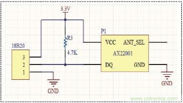 溫度采集單元主要有傳感器、處理器和電源組成,傳感器18B20負(fù)責(zé)區(qū)域內(nèi)溫度信息的采集和數(shù)據(jù)轉(zhuǎn)換,將溫度的傳感器信息經(jīng)過A/D轉(zhuǎn)換,得到數(shù)字信息,供處理器AX22001進(jìn)行處理。其原理圖如圖1所示,其中ANT_SEL引腳接天線,用來傳送無線信號(hào)。