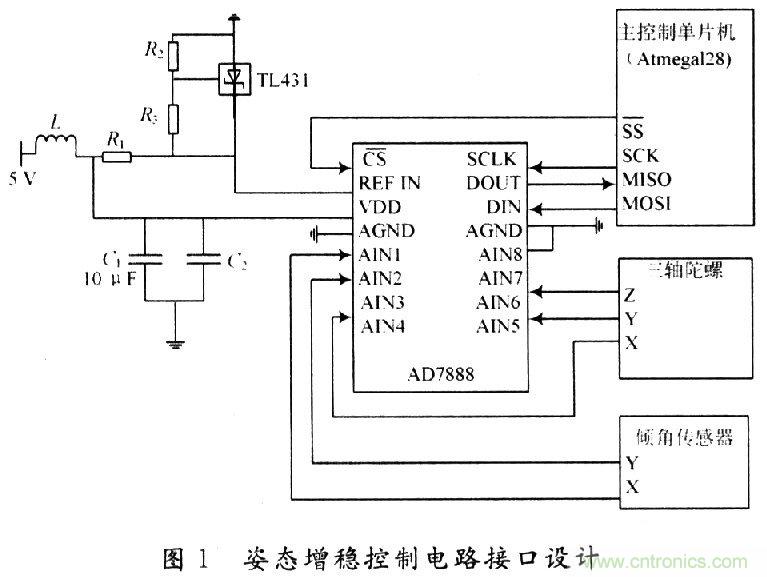 無人機內(nèi)回路控制作為外回路控制的基礎,對其能否穩(wěn)定飛行起著至關重要的作用。該系統(tǒng)中,內(nèi)回路是由三軸陀螺和傾角傳感器構(gòu)成的姿態(tài)增穩(wěn)控制回路。主要由主控制單片機、A/D采樣芯片、三軸陀螺儀和傾角傳感器組成。主控制單片機通過SPI串行總線與A/D采樣芯片相連,通過A/D采樣芯片獲得三軸陀螺儀的角速率與傾角傳感器的橫滾角和俯仰角,然后進行姿態(tài)信息融合,得到無人機俯仰和橫滾的姿態(tài)信息。主要接口連接情況如圖1所示。