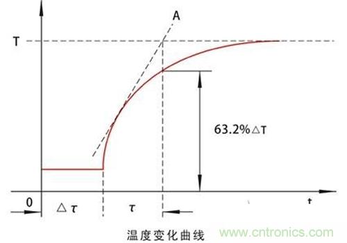 實踐證明熱電偶、熱電阻、雙金屬溫度計當被測溫度突然發(fā)生變化時,其輸出會延遲一段時間,這段延遲時間△τ一般叫做純滯后或純時延。在延遲△τ后,會以近似于指數(shù)曲線的規(guī)律變化(如下圖所示),如忽略△τ,并以介質(zhì)溫度變化做計時起點,則上述曲線符合T=△T(1-e-t/τ),此式中T為溫度;△T為溫度變化;t為時間;τ為時間常數(shù)。時間常數(shù)及時反應(yīng)曲線起點的切線與平衡溫度交點A所對應(yīng)的時間,也就是輸出變化63.2%△T所需要的時間。