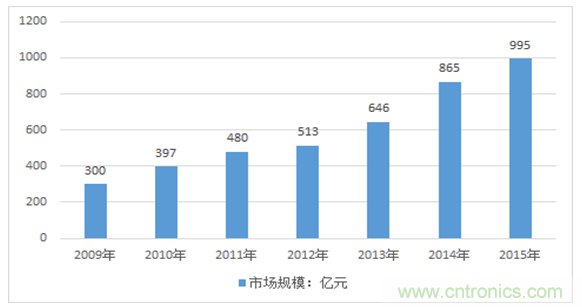 近年來,國(guó)內(nèi)傳感器市場(chǎng)持續(xù)快速增長(zhǎng),年均增長(zhǎng)速度超過20%,2011年傳感器市場(chǎng)規(guī)模為480億元,2012年達(dá)到513億元,2015年則達(dá)到995億元。近幾年我國(guó)傳感器行業(yè)市場(chǎng)規(guī)模情況如下圖所示: