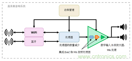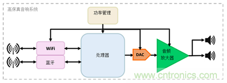 處理器執(zhí)行各種音頻處理功能,如解碼和信號均衡,同時也處理Wi-Fi和/或藍(lán)牙通信軟件堆棧。過去,CD品質(zhì)的采樣頻率可能已足夠。但是今天的高保真音頻系統(tǒng)對信號鏈中的處理器提出了其它要求,因為高保真音質(zhì)要求在24位音樂信號流中提供48kHz至192kHz范圍內(nèi)的采樣率。