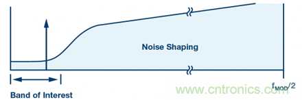 Σ-Δ型調(diào)制器通過對反饋回路(量化器輸出)調(diào)制,進而實現(xiàn)對量化噪聲整形,,從而降低目標頻段內(nèi)的噪聲,但代價是增加帶外噪聲,如圖3所示。