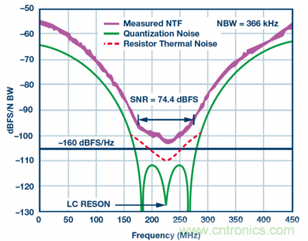 即使不進行完整分析,也可以看到,對于Σ-Δ型調(diào)制器,使用NSD作為確定帶內(nèi)可用動態(tài)范圍的規(guī)格尤為有效。圖4顯示的是高速帶通Σ-Δ型ADC放大后的噪底曲線。在75 MHz目標頻段內(nèi)(中心頻率為225 MHz),噪聲為-160 dBFS/Hz左右,SNR超過74 dBFS。
