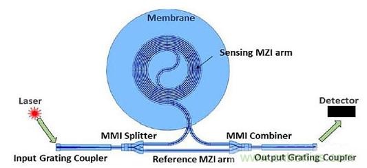 在制造該器件的過程中,創(chuàng)制了一個(gè)傳感膜。當(dāng)膜彎曲時(shí),波導(dǎo)的位置發(fā)生變化,從而引起光路延伸,導(dǎo)致該特定臂發(fā)生相移(圖2)。