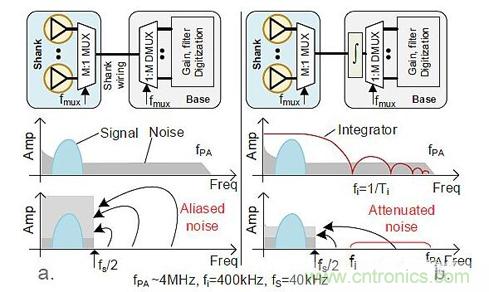 神經(jīng)探針的信號(hào)帶寬約為7.5kHz,可以采用15kHz對(duì)PA輸出采樣。設(shè)計(jì)人員發(fā)現(xiàn)可以將時(shí)分復(fù)用技術(shù)嵌入柄中(圖4a)。這樣做可以使每個(gè)獨(dú)特的柄線上有M個(gè)PA輸出。如果沒有加抗混疊濾波器進(jìn)行限制,則PA帶寬會(huì)由于折疊而產(chǎn)生帶內(nèi)噪聲。在采樣發(fā)生之前,將低通濾波器裝入這個(gè)小PA區(qū)域是不可能的。設(shè)計(jì)人員選擇使用能夠在Ti時(shí)間段對(duì)信號(hào)進(jìn)行積分的架構(gòu)(圖4b)來衰減超出采樣頻率fi的信號(hào),從而提高信噪比(SNR)。