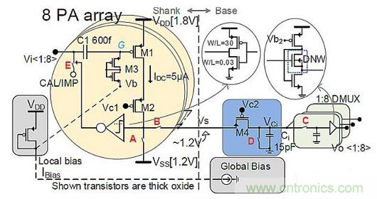探針架構(gòu)設(shè)計(jì)(圖5)中的信號(hào)流,通過一條共享柄線從8個(gè)多路復(fù)用PA陣列的輸出流向底座。然后,該信號(hào)進(jìn)入探針底座中的積分器,積分器的輸出通過8個(gè)標(biāo)記為Vo的采樣保持電路進(jìn)行解復(fù)用。接下來,8個(gè)單獨(dú)的Vo中的每一個(gè)都進(jìn)入自己的信道模塊,它們對(duì)信號(hào)進(jìn)行放大和濾波,使得輸出僅有感興趣的頻帶。接下來,所有20個(gè)通道經(jīng)過多路復(fù)用并由10位逐次逼近寄存器式(SAR)模數(shù)轉(zhuǎn)換器(ADC)進(jìn)行數(shù)字化,并發(fā)送至為ADC和多路復(fù)用/多路解復(fù)用器(MUX/DEMUX)提供時(shí)鐘的數(shù)字控制模塊。在此,所有ADC的并行輸出經(jīng)串行化后僅有6條數(shù)據(jù)線。