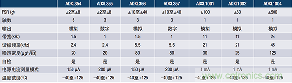 ADI公司最近推出了一系列新型低噪聲、低功耗、3軸加速度計:提供模擬輸出的ADXL354;提供數(shù)字輸出和±2 g、±4 g、±8 g可編程范圍的ADXL355;提供模擬輸出的ADXL356;提供數(shù)字輸出和±10 g、±20 g、±40 g可編程范圍的ADXL357。