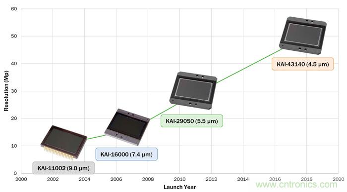 Interline Transfer CCD技術(shù)用于開發(fā)高分辨率、大格式圖像傳感器已超過15年,其分辨率隨市場需要逐漸提高。例如,2003年的KAI-11000圖像傳感器以35 mm光學(xué)格式提供1100萬像素的分辨率;但到2011年,這種相同的光學(xué)格式幾乎可支持三倍的分辨率。