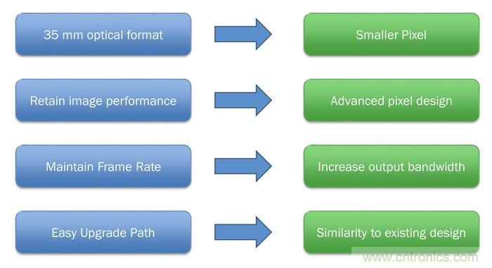 為了在保留35 mm光學(xué)格式的同時,將器件(例如KAI-29050)的分辨率從現(xiàn)有的2900萬像素繼續(xù)提升,就需要更小的像素格式,以便將更多像素放置于給定區(qū)域中。但為同時保留這一較小像素中的關(guān)鍵成像參數(shù),如圖像均勻性、動態(tài)范圍和底噪,除了簡單地縮小尺寸外,還需要提升像素設(shè)計。