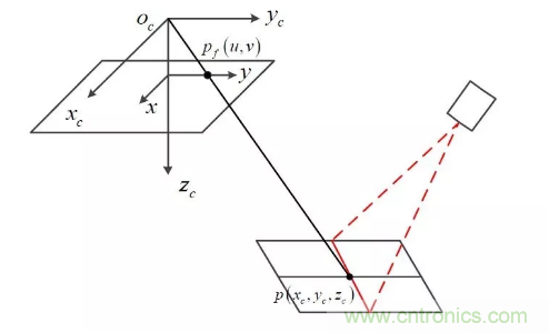 依據(jù)激光條紋特征點(diǎn)圖像坐標(biāo)就可以得到其在攝像機(jī)坐標(biāo)系下的三維坐標(biāo)